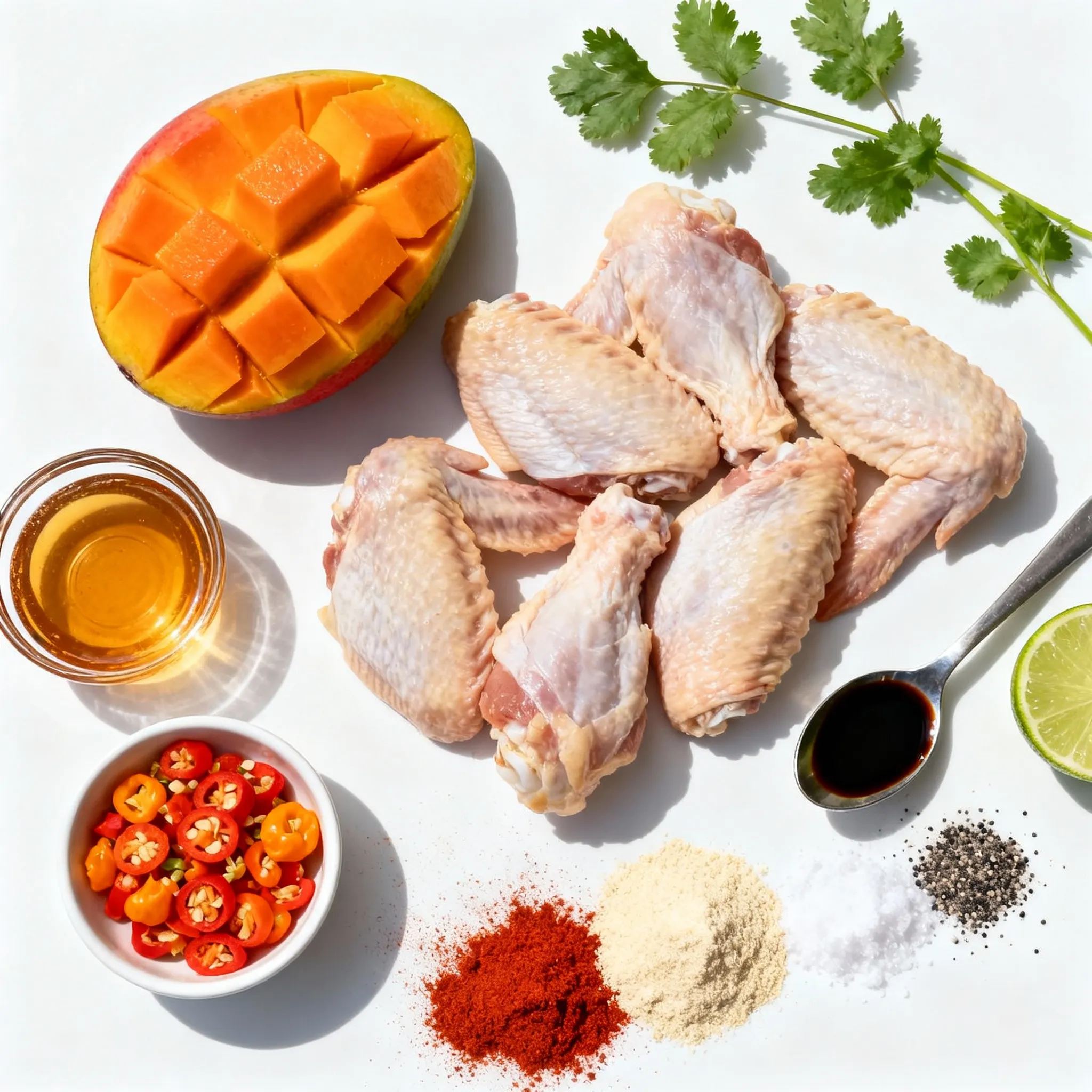 Die Hauptzutaten für Mango Habanero Chicken Wings sind einfach, aber lecker. Du brauchst 900 Gramm Hähnchenflügel. Diese Flügel sind perfekt für das Grillen oder Backen. Die reife Mango bringt eine süße Note. Sie wird püriert, um eine glatte Marinade zu schaffen. Die Habanero-Paprika sorgt für eine scharfe Kick. Du kannst die Menge an Habaneros anpassen, wenn du es weniger scharf magst.