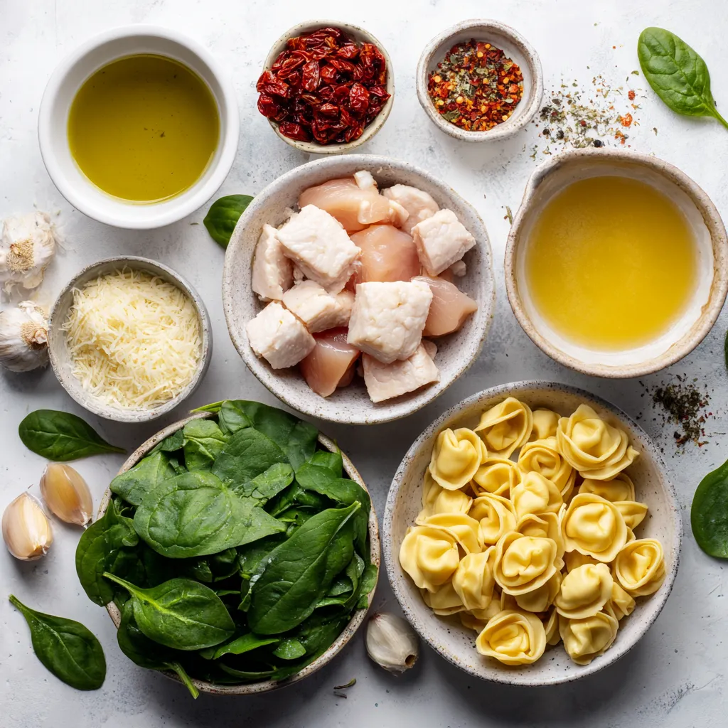 Ein köstliches Gericht mit Hähnchen, Tortellini und frischem Spinat in einer cremigen Sauce.
