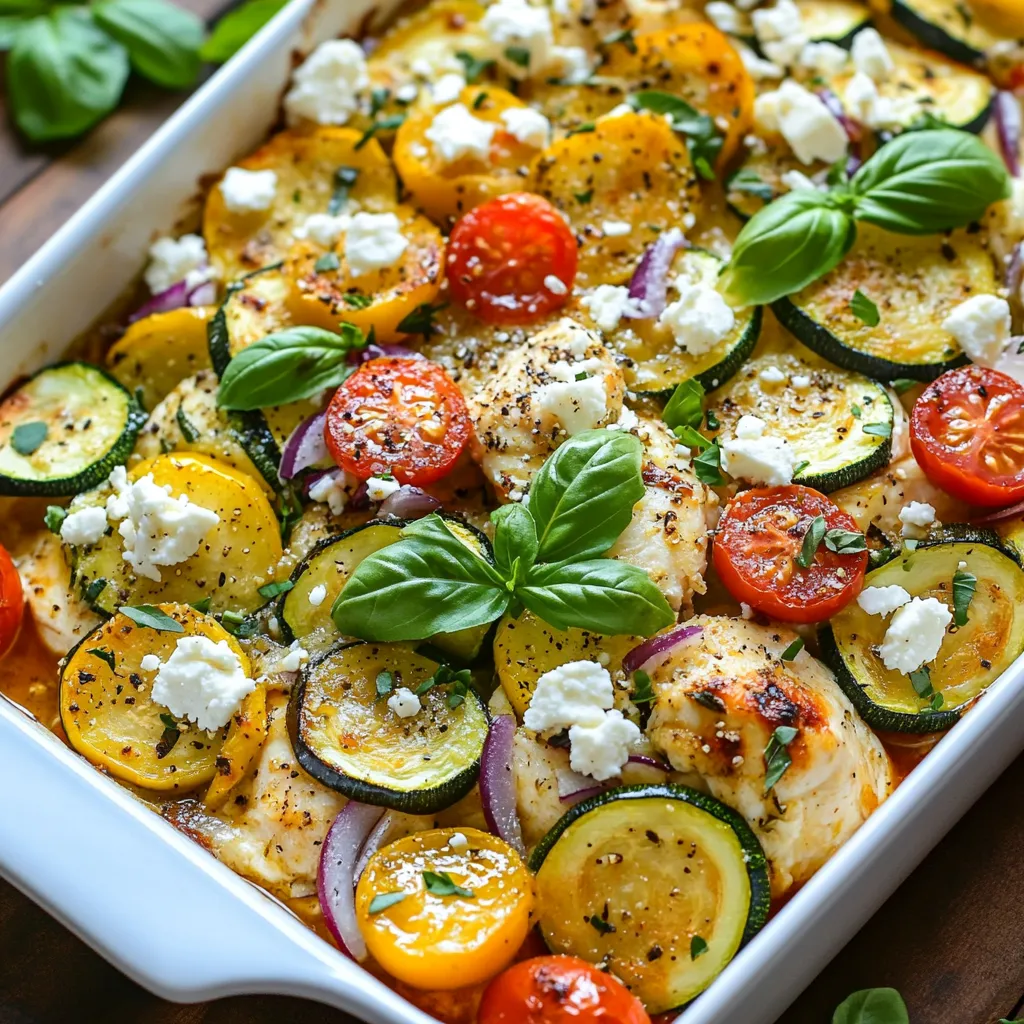 Ein köstlicher Auflauf mit Hähnchenbrust, Zucchini und Feta, perfekt für ein herzhaftes Abendessen.