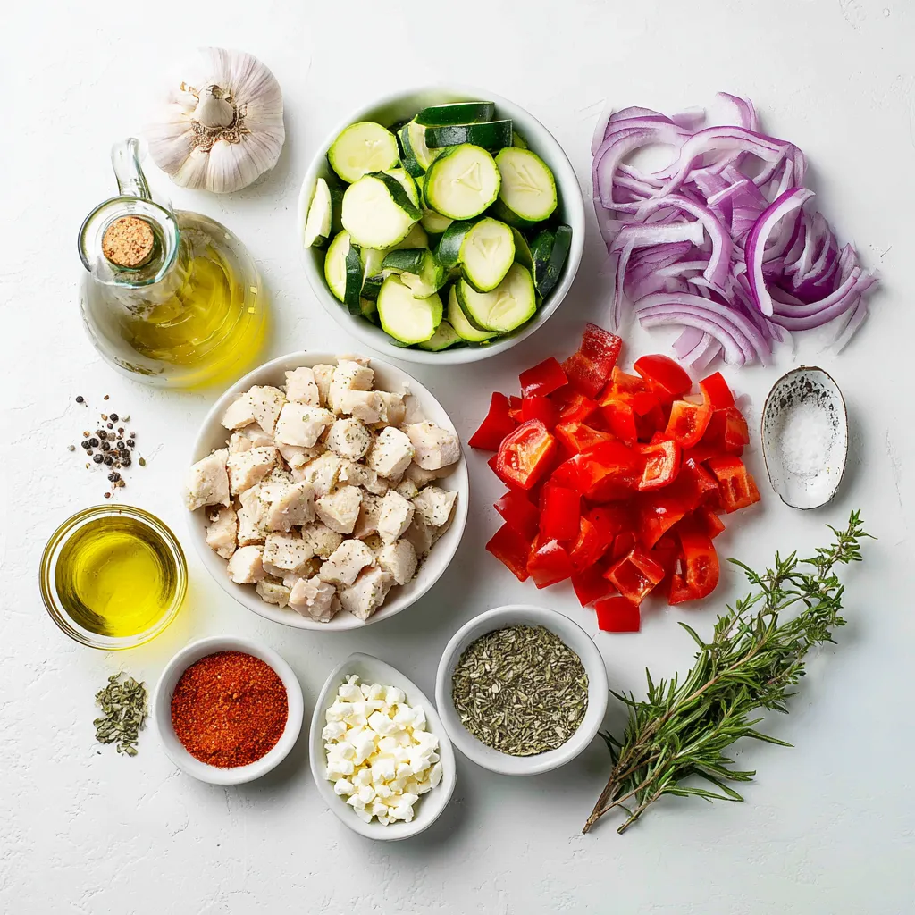 Die Hauptzutaten sind frisch und gesund. Hähnchenbrustfilets geben viel Protein. Zucchini und Paprika bringen Farbe und Vitamine. Zwiebeln und Knoblauch bieten einen tollen Geschmack. Kirschtomaten sorgen für eine süße Note. Der zerbröselte Feta rundet das Gericht ab.