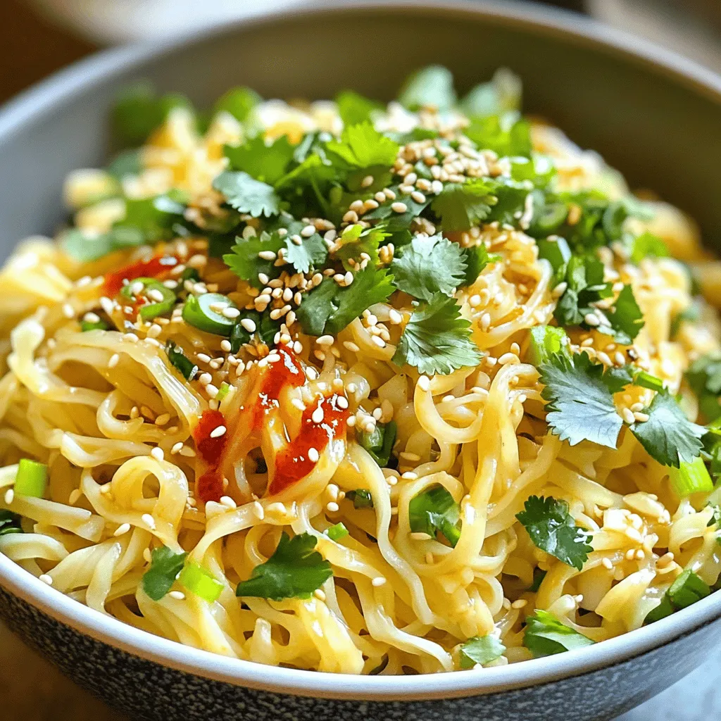 Für den letzten Schliff streue die fein gehackten Frühlingszwiebeln über die Nudeln. Mische erneut, um die Aromen zu vereinen. Passen die Geschmäcker? Füge nach Bedarf mehr Salz oder Chili hinzu. Dein Gericht ist jetzt bereit. Serviere die Nudeln in tiefen Schüsseln und garniere sie mit frischem Koriander. Guten Appetit!