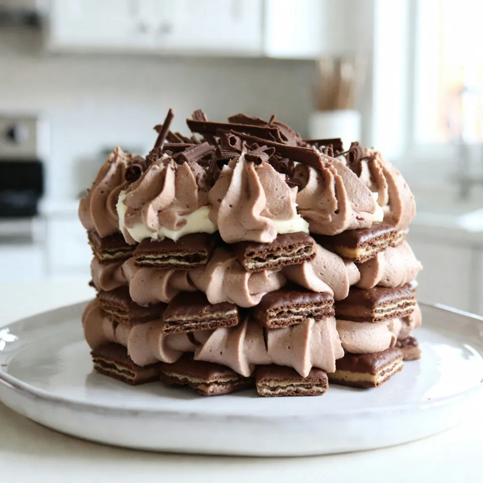 Zusätzliche Zutaten wie Vanilleextrakt und Kakaopulver machen die Schlagsahne noch aromatischer. Schokoladenwafer-Kekse sind perfekt, um eine schokoladige Basis zu schaffen. Mascarpone-Käse verleiht dem Ganzen eine cremige Note. Schließlich bringen Schokoladenspäne den letzten Schliff auf die Torte.