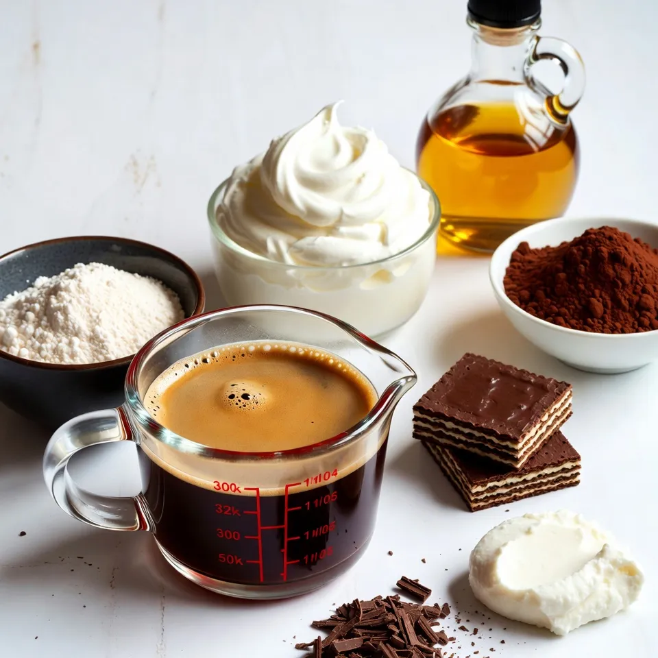 Die Hauptzutaten für die Mocha Layered Icebox Cake sind einfach und lecker. Stark gebrühter Kaffee bringt den vollen Geschmack. Schlagsahne sorgt für die leichte Textur. Puderzucker gibt der Schlagsahne die nötige Süße.