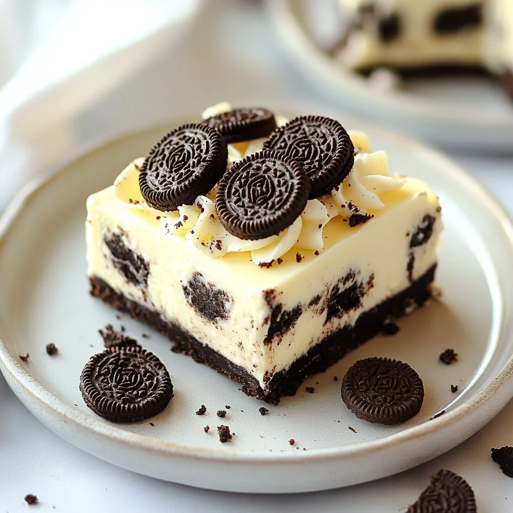 Servieren und garnieren: Sobald der Cheesecake gefestigt ist, in Riegel schneiden und nach Belieben mit zusätzlichen Oreo-Keksen dekorieren. Kaltdienen.