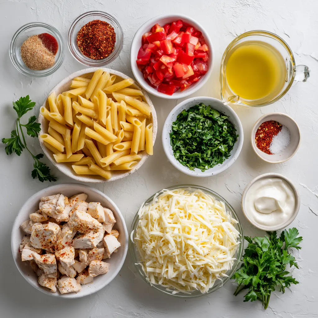 Für meine One Pot Creamy Cajun Pasta brauche ich einige Hauptzutaten. Hier sind sie: