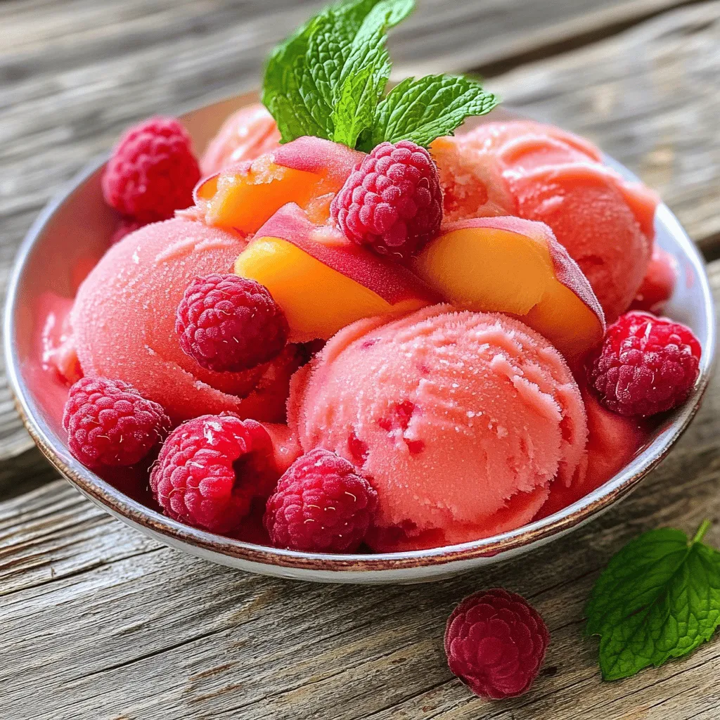 Die Hauptzutaten sind einfach, aber sie machen das Sorbet besonders. Wähle reife Pfirsiche, die süß und saftig sind. Sie sind der Schlüssel zu einem großartigen Geschmack. Die Himbeeren bringen eine frische, fruchtige Note. Ihre Säure balanciert die Süße der Pfirsiche.