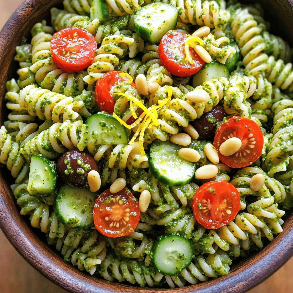 ![- 340 g Fusilli-Nudeln - 1 Tasse frische Basilikumblätter - 1/2 Tasse geröstete Pinienkerne - 1/2 Tasse geriebener Parmesan - 3 Knoblauchzehen - 1/2 Tasse natives Olivenöl extra - 1 Tasse Kirschtomaten, halbiert - 1 Tasse Gurke, gewürfelt - 1/4 Tasse Kalamata-Oliven, entsteint - Salz und Pfeffer nach Geschmack - Schale und Saft von 1 Zitrone Bei der Zubereitung eines Pesto Pasta Salads sind die Zutaten entscheidend. Die Fusilli-Nudeln bringen eine schöne Form und Textur. Die frischen Basilikumblätter geben dem Gericht einen klaren, aromatischen Geschmack. Geröstete Pinienkerne fügen eine nussige Note hinzu. Die weiteren Zutaten, wie der geriebene Parmesan und der Knoblauch, sind wichtig für das Pesto. Sie sorgen für die richtige Tiefe und Reichhaltigkeit. Natives Olivenöl extra ist ein Muss. Es macht das Pesto cremig und vollmundig. Für das Gemüse und die Gewürze wählen wir frische Kirschtomaten und knusprige Gurken. Sie bringen Knackigkeit in den Salat. Kalamata-Oliven verleihen eine salzige Note, die den Geschmack verstärkt. Zitronenschale und -saft bringen Frische und Balance. Wenn du nach dem vollständigen Rezept suchst, kannst du es hier finden: [Full Recipe]. Zuerst bereiten Sie einen großen Topf mit Wasser vor. Fügen Sie viel Salz hinzu, um den Geschmack der Nudeln zu verbessern. Bringen Sie das Wasser zum Kochen. Geben Sie dann 340 g Fusilli-Nudeln in das kochende Wasser. Kochen Sie sie al dente, das heißt, sie sollten weich, aber noch bissfest sein. Nach dem Kochen gießen Sie die Nudeln ab. Spülen Sie sie mit kaltem Wasser ab, um den Garprozess zu stoppen. Für das Pesto verwenden Sie eine Küchenmaschine. Geben Sie die frischen Basilikumblätter, gerösteten Pinienkerne, geriebenen Parmesan und die Knoblauchzehen in die Maschine. Pulsieren Sie die Mischung, bis alles fein gehackt ist. Während die Maschine läuft, fügen Sie langsam 1/2 Tasse natives Olivenöl extra hinzu. Dies macht das Pesto schön cremig. Schmecken Sie es mit Salz und Pfeffer ab. Falls das Pesto zu dick ist, können Sie mehr Olivenöl hinzufügen, um die Konsistenz zu verbessern. In einer großen Rührschüssel kombinieren Sie die abgekühlten Nudeln mit dem Pesto. Fügen Sie dann 1 Tasse halbierte Kirschtomaten, 1 Tasse gewürfelte Gurke und 1/4 Tasse Kalamata-Oliven hinzu. Mischen Sie alles vorsichtig, bis die Nudeln gleichmäßig mit dem Pesto überzogen sind. Um das Gericht zu verfeinern, geben Sie die Schale und den Saft von 1 Zitrone dazu. Dies bringt einen frischen Geschmack, der das Gericht hebt. Mischen Sie alles gut durch. Lassen Sie den Salat dann für mindestens 30 Minuten im Kühlschrank ruhen, damit die Aromen sich verbinden. Für das vollständige Rezept schauen Sie bitte hier: [Full Recipe]. Um die beste Konsistenz für dein Pesto zu erreichen, kannst du Olivenöl anpassen. Wenn dein Pesto zu dick ist, füge langsam mehr Olivenöl hinzu. Das sorgt für eine cremige Textur. Du kannst auch leichtere oder intensivere Zutaten verwenden. Zum Beispiel sind frische Kräuter wie Petersilie oder Rucola tolle Alternativen. Sie geben deinem Pesto einen neuen Geschmack. Bereite den Salat einen Tag vorher vor. So können sich die Aromen besser entfalten. Das macht den Geschmack noch intensiver. Pesto Pasta Salad ist ideal für Partys und Zusammenkünfte. Du kannst ihn im Kühlschrank lagern und dann einfach servieren. Das spart Zeit und sorgt für weniger Stress. Präsentiere den Salat ansprechend. Verwende frische Basilikumblätter und ganze Kirschtomaten zur Garnierung. Das sieht nicht nur schön aus, sondern macht den Salat auch frischer. Zu diesem Gericht passen tolle Beilagen. Zum Beispiel ein leichter grüner Salat oder frisch gebackenes Brot. Auch ein spritziger Weißwein kann gut dazu harmonieren. {{image_4}} Wenn Sie eine vegetarische oder vegane Variante des Pesto Pasta Salads wünschen, können Sie den Käse leicht ersetzen. Anstelle von Parmesan nutzen Sie Hefeflocken. Diese geben einen tollen, käsigen Geschmack ohne tierische Produkte. Für zusätzliche pflanzliche Proteine fügen Sie Kichererbsen oder Linsen hinzu. Diese Zutaten machen den Salat nahrhafter und sättigender. Um Ihren Pesto Pasta Salad noch bunter und gesünder zu machen, können Sie saisonales Gemüse hinzufügen. Paprika oder Zucchini sind perfekte Ergänzungen. Sie bringen Farbe und einen frischen Geschmack. Auch andere Nüsse oder Samen wie Mandeln oder Sonnenblumenkerne passen gut hinein. Diese Zutaten geben dem Salat einen knackigen Biss und mehr Textur. Das Pesto selbst kann auch variieren. Probieren Sie verschiedene Kräuter wie Petersilie oder Rucola. Diese Kräuter verleihen dem Pesto einen neuen Geschmack. Auch die Nüsse können variieren. Walnüsse oder Mandeln sind großartige Alternativen zu Pinienkernen. Diese Variationen bringen Abwechslung und neue Aromen in Ihr Gericht. Legen Sie den Pesto Pasta Salad in einen luftdichten Behälter. So bleibt der Salat frisch. Sie können ihn bis zu drei Tage im Kühlschrank aufbewahren. Achten Sie darauf, den Salat vor dem Schließen gut durchzumischen. So bleiben die Aromen lebendig und frisch. Einfrieren ist eine großartige Option für Reste. Teilen Sie den Salat in Portionen auf. Verwenden Sie gefrierfeste Beutel oder Behälter. Achten Sie darauf, die Luft herauszudrücken. So vermeiden Sie Gefrierbrand. Der Salat kann bis zu zwei Monate eingefroren werden. Zum Auftauen legen Sie ihn einfach in den Kühlschrank. Lassen Sie ihn über Nacht auftauen. Mischen Sie ihn vor dem Servieren gut durch. Vor dem Servieren empfehle ich, den Salat kurz auf Zimmertemperatur kommen zu lassen. Das bringt die Aromen wieder zur Geltung. Mischen Sie den Salat erneut, um alle Zutaten gleichmäßig zu verteilen. Wenn nötig, fügen Sie einen Spritzer frisches Olivenöl oder Zitronensaft hinzu. Dies gibt dem Salat zusätzlichen Geschmack. Achten Sie darauf, dass der Salat frisch schmeckt und die Farben lebendig bleiben. Reste vom Pesto Pasta Salad halten sich gut im K