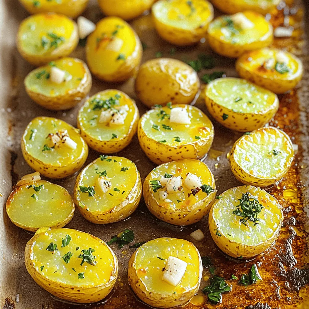 Heize deinen Ofen auf 220°C vor. Ein heißer Ofen hilft, die Kartoffeln knusprig zu machen. Nimm eine große Schüssel. Halbiere die Baby-Kartoffeln und gib sie in die Schüssel. Zerdrücke die Knoblauchzehen. Füge sie ebenfalls hinzu. Diese Mischung gibt den Kartoffeln viel Geschmack.