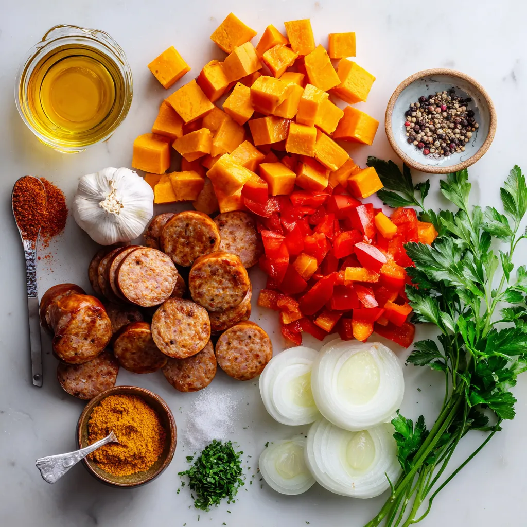 Geräuchertes Paprikapulver bringt einen tollen, rauchigen Geschmack. Es passt gut zu den Süßkartoffeln und Würstchen. Olivenöl hilft, alles gut zu vermischen und macht das Gemüse zart. Salz und Pfeffer sind einfach, aber wichtig, um den Geschmack zu betonen.