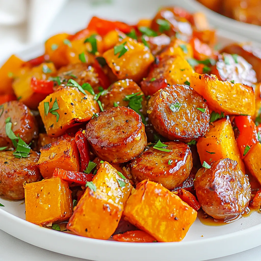 Ein köstliches Gericht mit scharfen Putenwürstchen, Süßkartoffeln und einer aromatischen Honig-Knoblauch-Glasur.