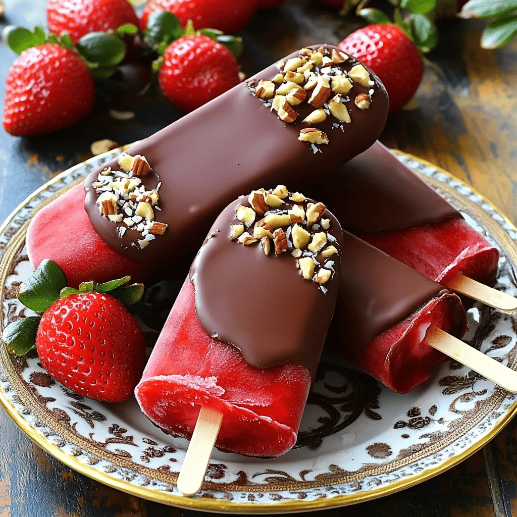Für eine schöne Präsentation legen Sie die Popsicles auf einen dekorativen Teller. Garnieren Sie sie mit frischen Erdbeeren und einem kleinen Schokoladentransfer von der restlichen geschmolzenen Schokolade. Dies sorgt für einen tollen visuellen Effekt.