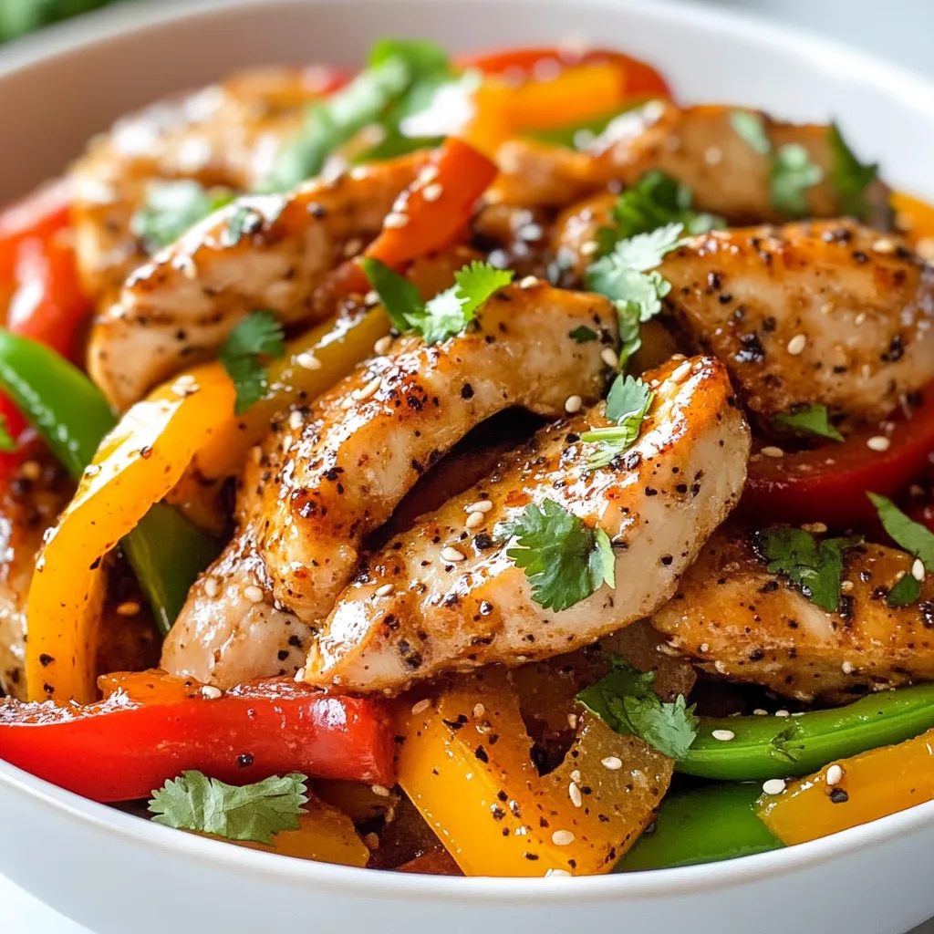 Ein würziges und schmackhaftes Hühnchengericht mit Paprika und Zuckerschoten.