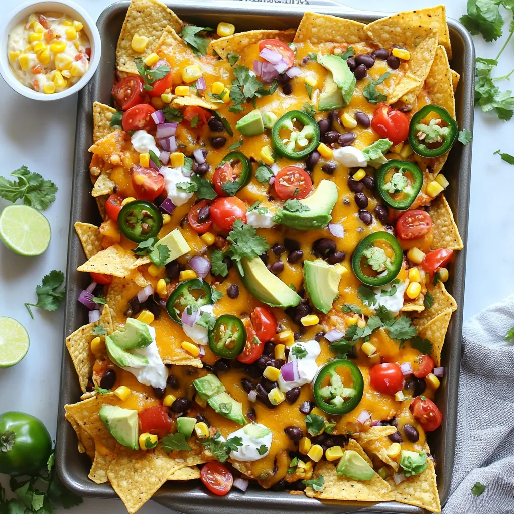 Für die besten Sheet Pan Nachos verwenden Sie frische Zutaten. Die Kombination aus Cheddar- und Monterey Jack-Käse bringt tollen Geschmack. Fügen Sie schwarze Bohnen und Mais hinzu, um mehr Textur zu geben. Jalapeños geben einen scharfen Kick, während Avocado und Koriander für Frische sorgen. Tomaten und rote Zwiebeln machen das Gericht bunt und lecker.