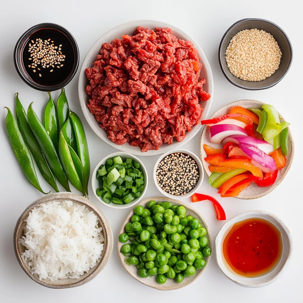 Diese Zutaten machen die Pfanne frisch und würzig. Das Rinderhackfleisch gibt dir eine gute Grundlage. Der Ingwer und Knoblauch bringen viel Geschmack. Die Paprika und Zuckerschoten sorgen für knackige Textur.