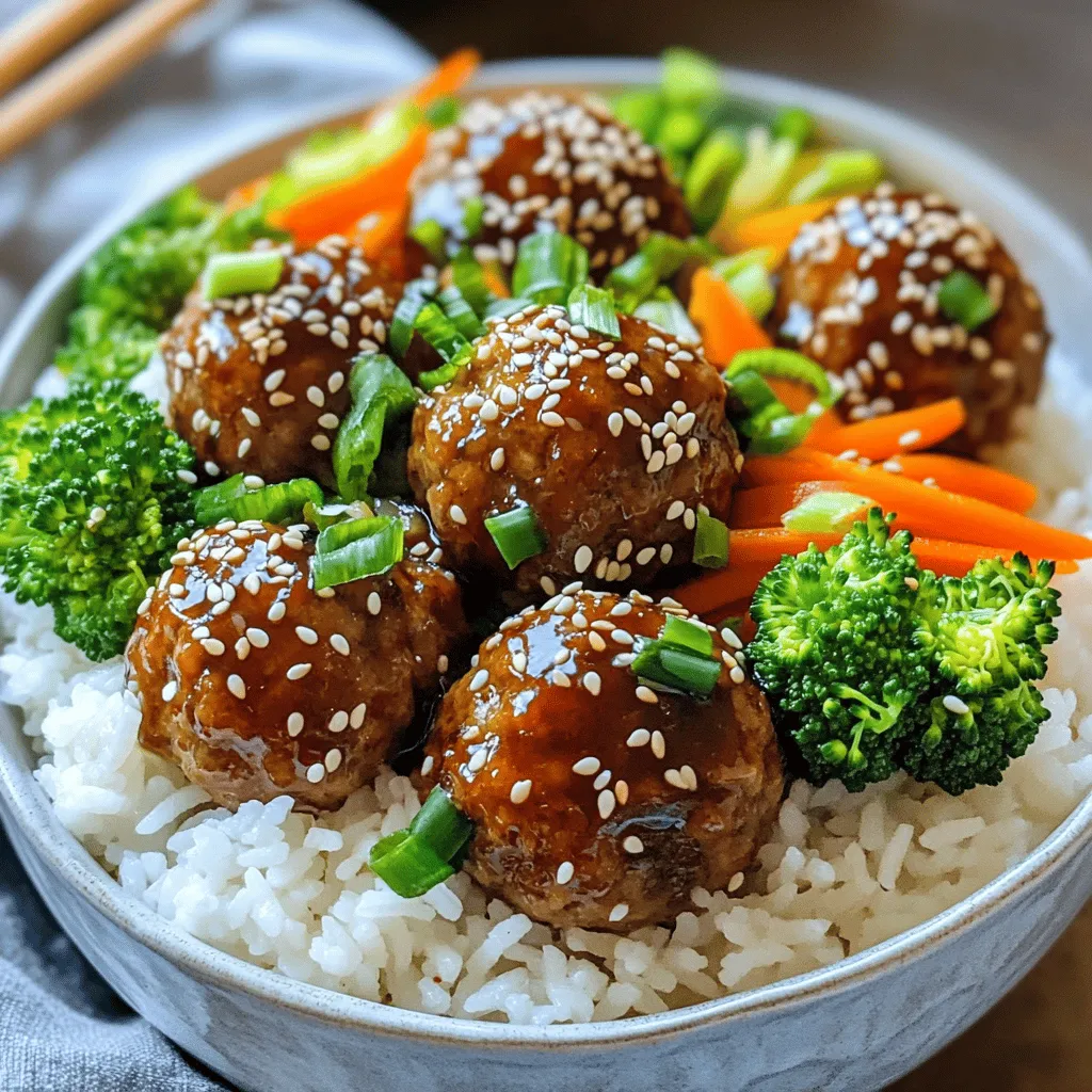 Die Präsentation macht einen großen Unterschied. Beginne mit einer Schicht Reis als Basis. Platziere die Fleischbällchen schön darauf. Füge die gedämpften Brokkoliröschen und die Karotten hinzu. Garnieren mit Sesamsamen und frischen grünen Zwiebeln sorgt für einen tollen Look. Dies wird deine Gäste beeindrucken!