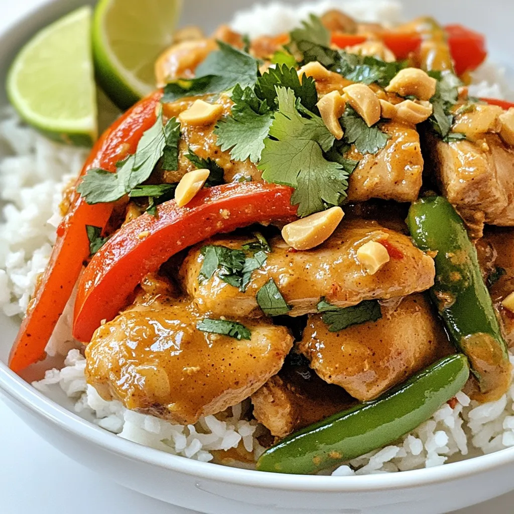 Thai Peanut Chicken Stir-Fry schmeckt großartig mit verschiedenen Beilagen. Serviere es mit Jasminreis oder Vollkornreis für mehr Biss. Auch Reisnudeln sind eine tolle Wahl. Wenn du etwas Gesundes möchtest, probiere Blumenkohlreis. Er passt gut zur Erdnusssoße und ist kalorienarm. Frische Frühlingsrollen oder ein grüner Salat ergänzen das Gericht perfekt.