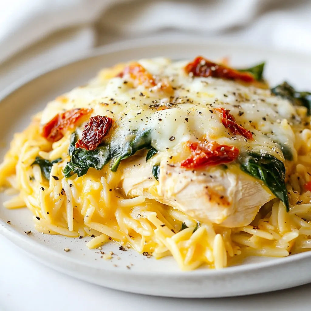 Um die Tuskanische Hühnchen-Orzo-Backe perfekt zu machen, achte auf die Kochzeit. Koche die Orzo-Nudeln nur bis sie al dente sind. So bleiben sie beim Backen nicht matschig. Verwende frische Zutaten für den besten Geschmack. Frischer Spinat bringt Farbe und Nährstoffe. Die Mischung aus Mozzarella und Parmesan sorgt für einen tollen Käsegeschmack.