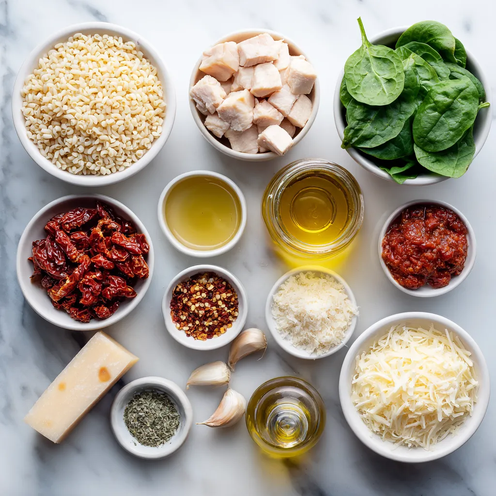 Diese Zutaten sind die Basis für das Gericht. Das Hähnchen gibt einen tollen Geschmack. Die Orzo-Nudeln sind perfekt, weil sie die Brühe gut aufnehmen. Spinat und Tomaten bringen Farbe und Frische.