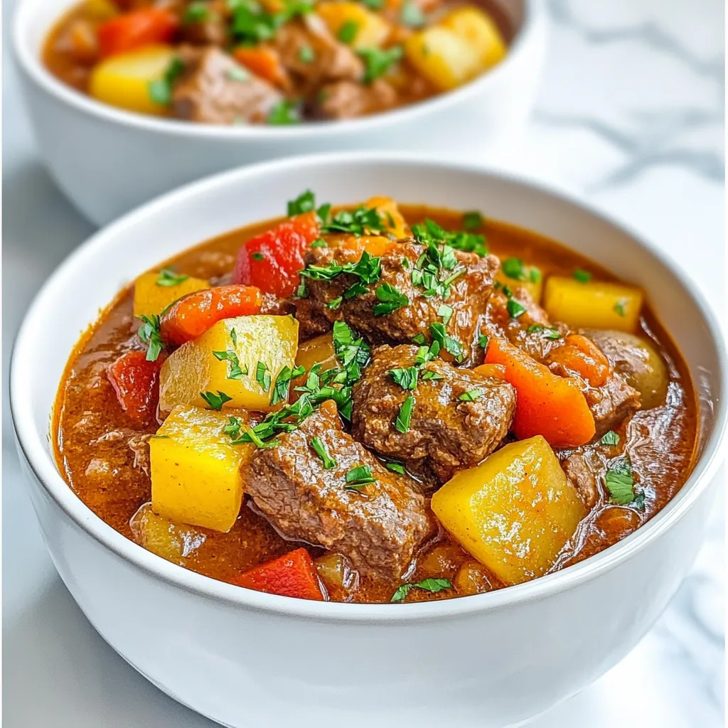 Beginne mit dem Rinderbraten. Schneide ihn in 2,5 cm große Würfel. Wähle frische, knackige Gemüsesorten. Würfle zwei große Zwiebeln und hacke drei Knoblauchzehen fein. Nimm zwei Paprika, eine rote und eine gelbe, und würfle sie. Schäle drei mittelgroße Kartoffeln und schneide sie in Stücke. Schneide auch vier mittelgroße Karotten in Scheiben. So hast du alle Zutaten bereit.