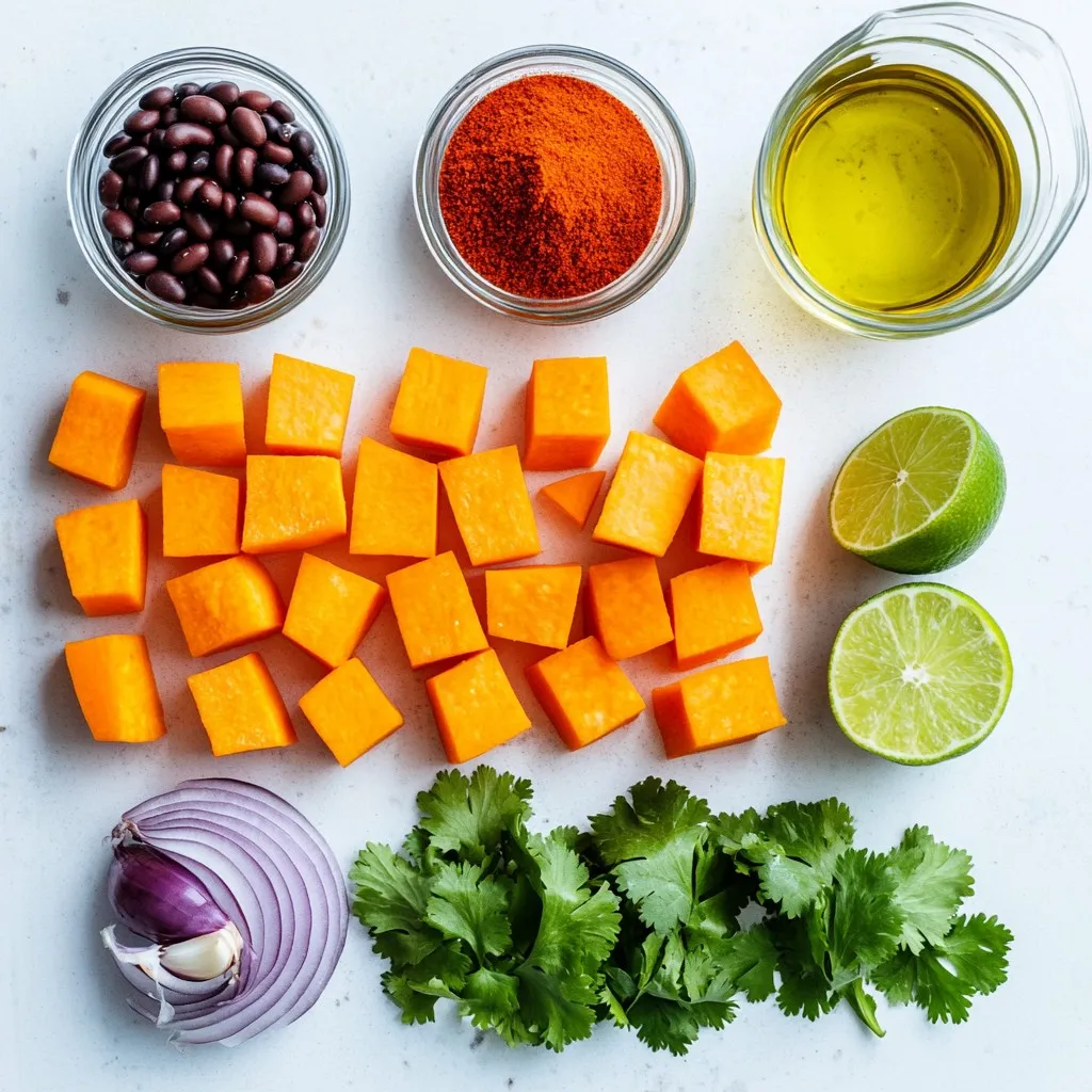 Die Hauptzutaten sind wichtig für den vollen Geschmack. Süßkartoffeln geben eine natürliche Süße und cremige Textur. Schwarze Bohnen liefern Protein und Ballaststoffe. Gewürfelte Tomaten bringen Feuchtigkeit und einen frischen Geschmack.