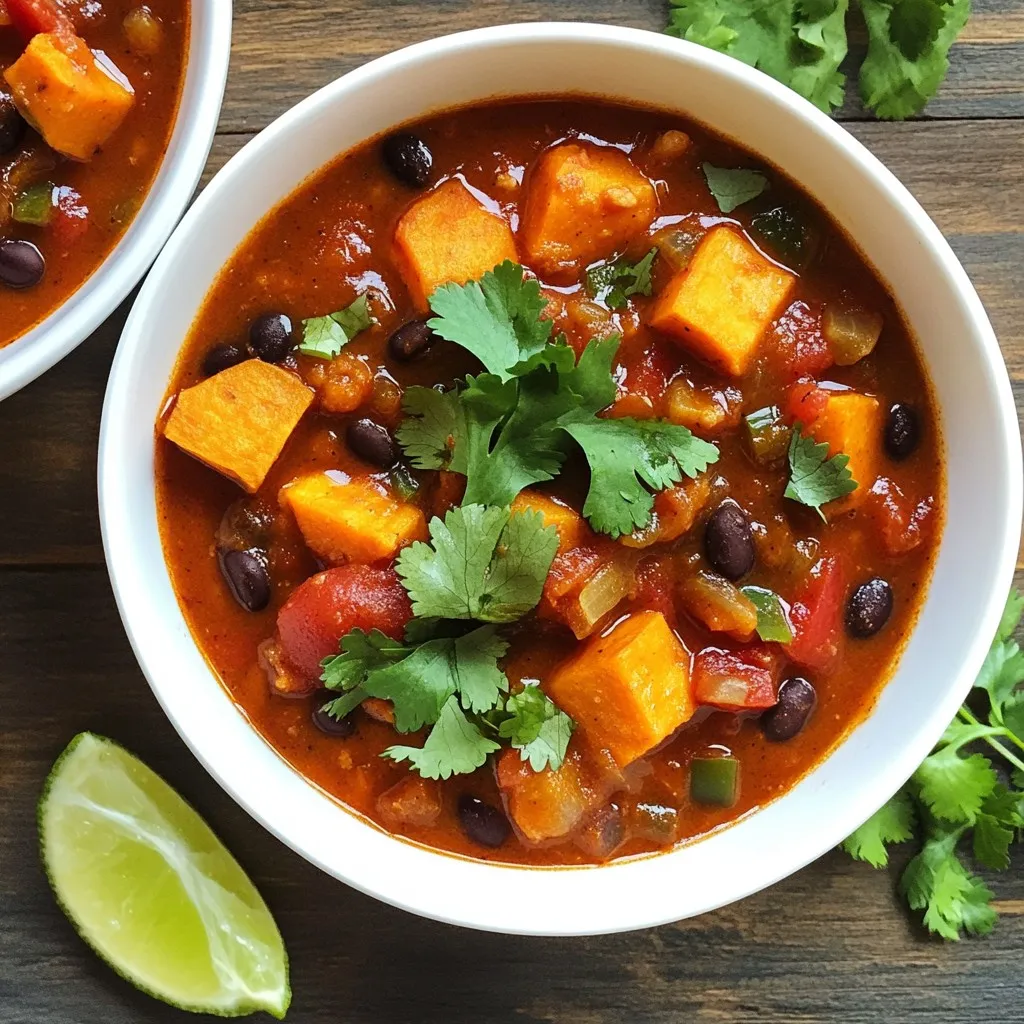 Ein würziges und herzhaftes Chili mit Süßkartoffeln und schwarzen Bohnen, perfekt für vegane Ernährung.