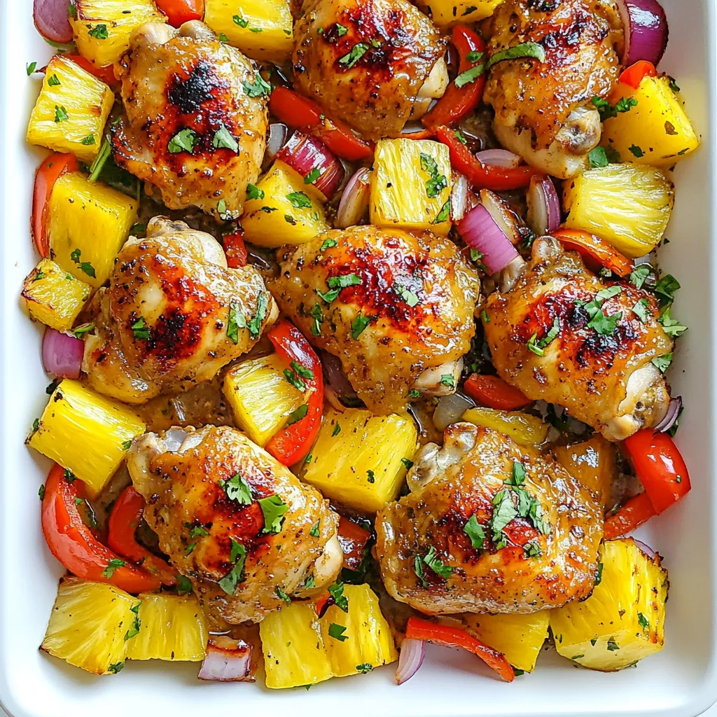 Ein köstliches und einfaches Gericht mit Hähnchenschenkeln, buntem Gemüse und Ananas, perfekt für eine gesunde Mahlzeit.